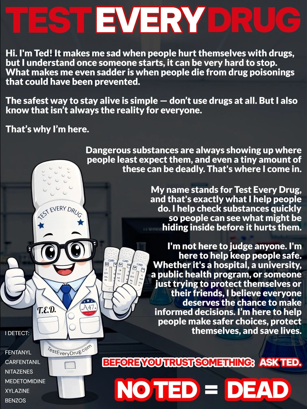 Through public education, national awareness campaigns, partnerships with law enforcement and public health organizations, and the expansion of accessible testing technology, the Test Every Drug movement seeks to prevent accidental poisonings and empower people with the information needed to make safer decisions.
